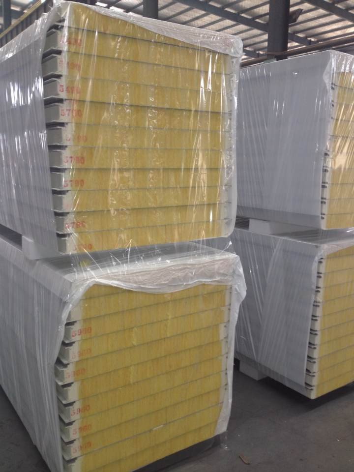El panel de emparedado compuesto del rockwool se compone de tres componentes. La hoja de acero superior es hecha por la hoja de acero prepintada acanalada, el material de la base es un mejor rockwool del aislante de calor, la hoja de acero inferior es hecho por la hoja de acero cubierta primero plana. Todo este tres compuestos adhesived por el pegamento.