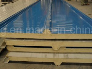 Los paneles de emparedado revestidos del color está utilizando el acero del color, el acero galvanizado de la hoja o del Galvalume como la superficie superior y más inferior y Lanas de EPS/Glass/lanas de roca /PU como el material de la base, composited por el pegamento especial del uso del edificio