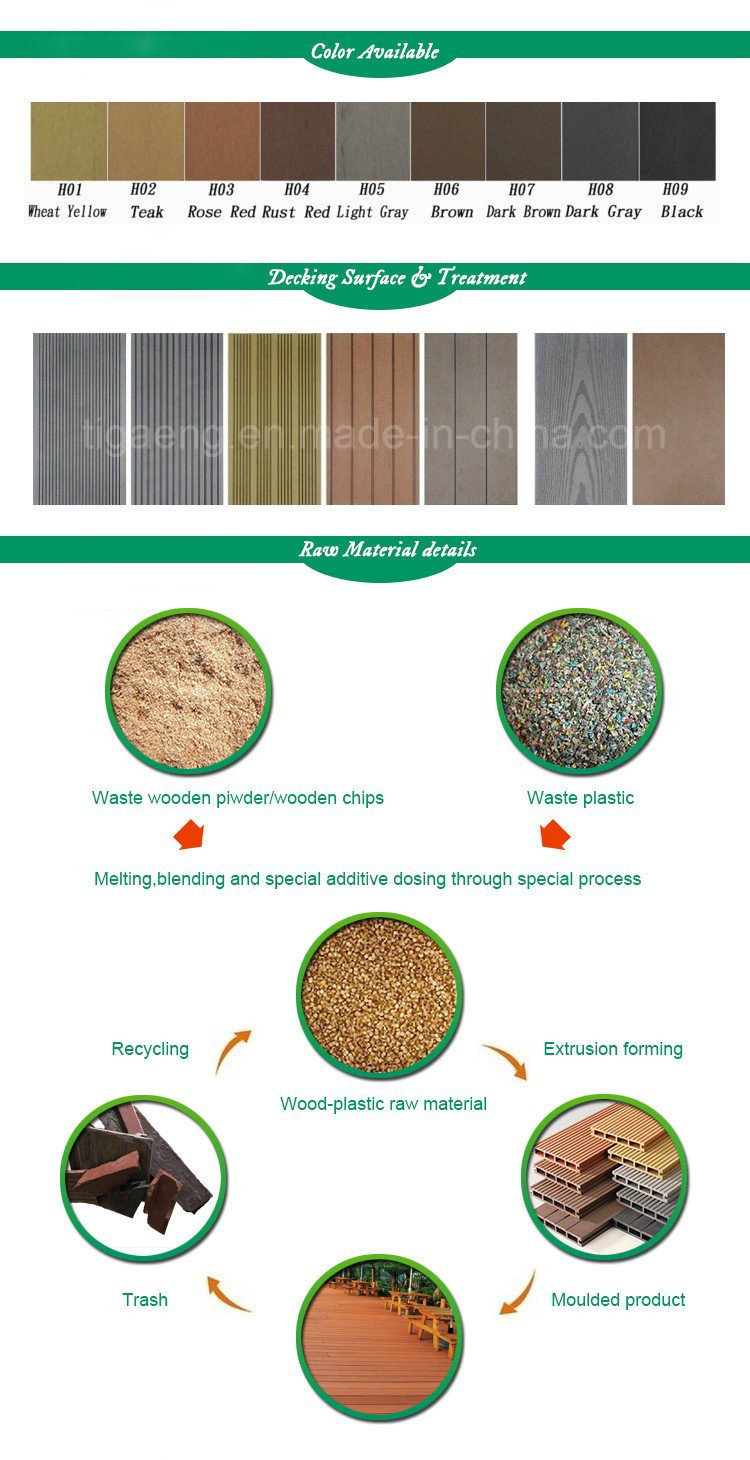 | Material | materiales plásticos ambientales del 35% (calificar Un HDPE reciclado) fibra de madera natural del 55% añadidos del producto químico del 10%. (Agente Anti-ULTRAVIOLETA, agente de la antioxidación, estabilizadores, colorantes, agente fungoso anti, agente de acoplamiento, reforzando el agente, los lubricantes.) |